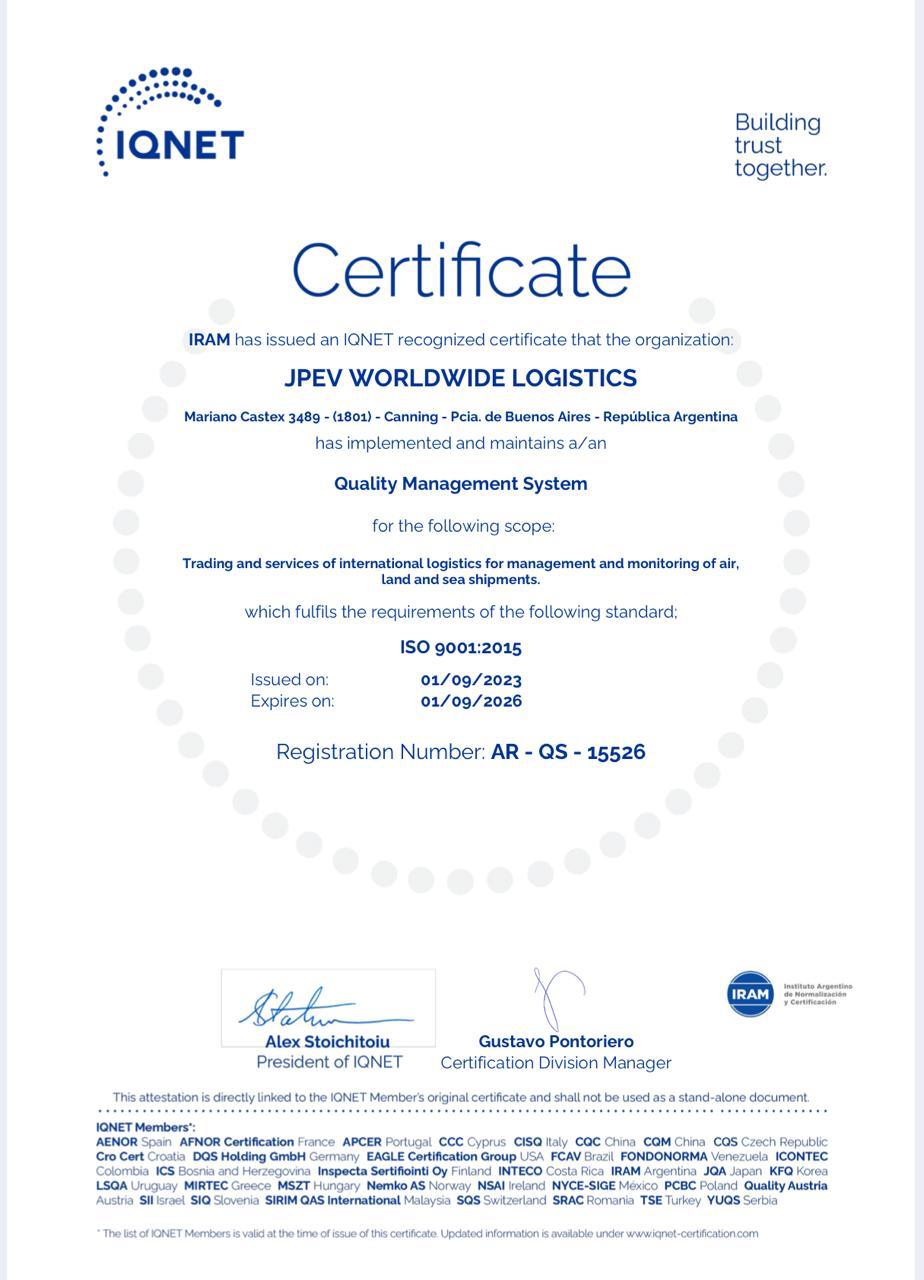 En JPEV Logistics contamos con la certificación ISO 9001:2015 emitida por IRAM, que respalda nuestro Sistema de Gestión de la Calidad y asegura que todos nuestros procesos cumplen con los más altos estándares internacionales.