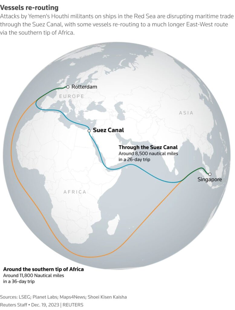 Los hutíes , apoyados por Irán, que controlan partes de Yemen tras años de guerra, comenzaron a atacar el transporte marítimo internacional en noviembre en apoyo del grupo islamista palestino Hamás en su guerra contra Israel en la Franja de Gaza. Las principales líneas navieras, entre ellas Maersk y Hapag-Lloyd, dejaron de utilizar las rutas del Mar Rojo en diciembre, y en su lugar emprendieron la ruta más larga  alrededor del sur de África a través del Cabo de Buena Esperanza.