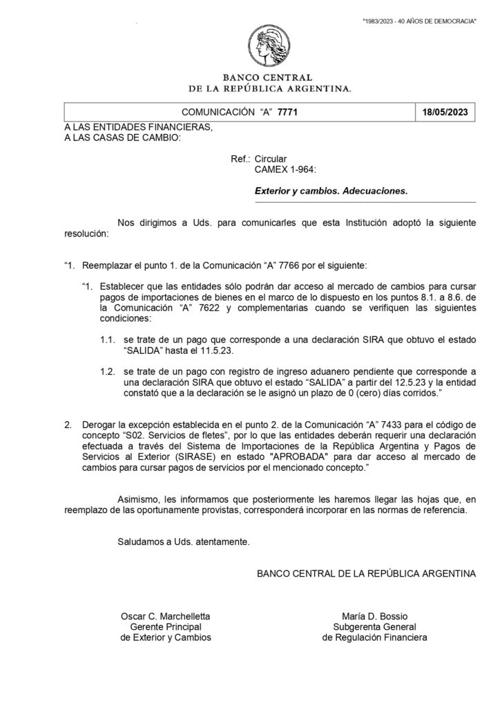 Con motivo de las restricciones vigentes para las transferencias de fletes internacionales desde nuestro país hacia el exterior, nos vemos en la necesidad de suspender temporalmente, los pagos de fletes de exportación en Argentina para nuevos bookings a partir del 05 de junio 2023.